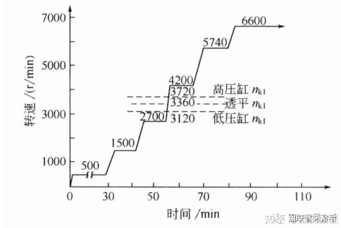 (如圖1所示的空氣壓縮機(jī)升速曲線)。在升速同時(shí)對機(jī)組運(yùn)行情況進(jìn)行全面檢查,一切正常才可繼續(xù)升速,直到調(diào)速器起作用的最低轉(zhuǎn)速(設(shè)計(jì)轉(zhuǎn)速的85%左右)。通過臨界轉(zhuǎn)速要適當(dāng)迅速,嚴(yán)密注意機(jī)組的振動(dòng)情況。